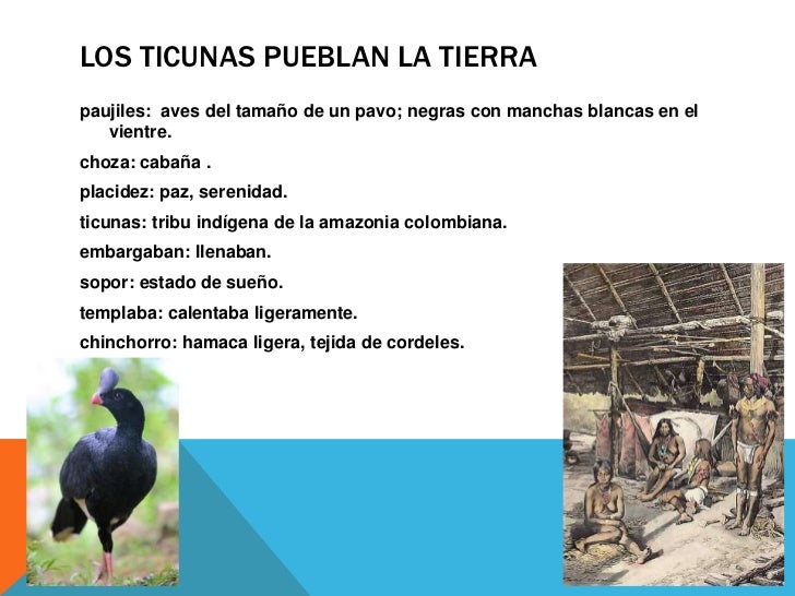 - 1. LOS TICUNAS PUEBLAN LA TIERRApaujiles: aves del tamaño de un pavo; negras con manchas blancas en el vientre.choza: cabaña .placidez: paz, serenidad.ticunas: tribu indígena de la amazonia colombiana.embargaban: llenaban.sopor: estado de sueño.templaba: calentaba ligeramente.chinchorro: hamaca ligera, tejida de cordeles.