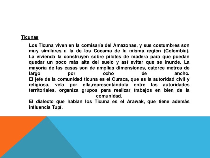 - 2. Ticunas Los Ticuna viven en la comisaría del Amazonas, y sus costumbres son muy similares a la de los Cocama de la misma región (Colombia). La vivienda la construyen sobre pilotes de madera para que puedan quedar un poco más alta del suelo y así evitar que se inunde. La mayoría de las casas son de amplias dimensiones, catorce metros de largo por ocho de ancho. El jefe de la comunidad ticuna es el Curaca, que es la autoridad civil y religiosa, vela por ella,representándola entre las autoridades territoriales, organiza grupos para realizar trabajos en bien de la comunidad. El dialecto que hablan los Ticuna es el Arawak, que tiene además influencia Tupí.
